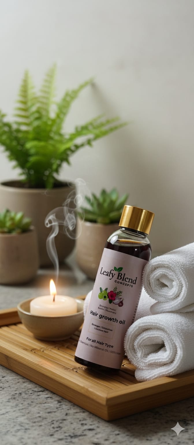 LeafyBlend Herbal Hair Growth Oil is a unique blend of traditional Ayurvedic herbs and modern hair care science. Inspired by a home recipe passed down through generations, it nourishes the scalp, strengthens hair roots, and supports healthy hair growth while calming the senses with a soothing aroma.